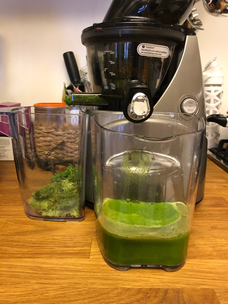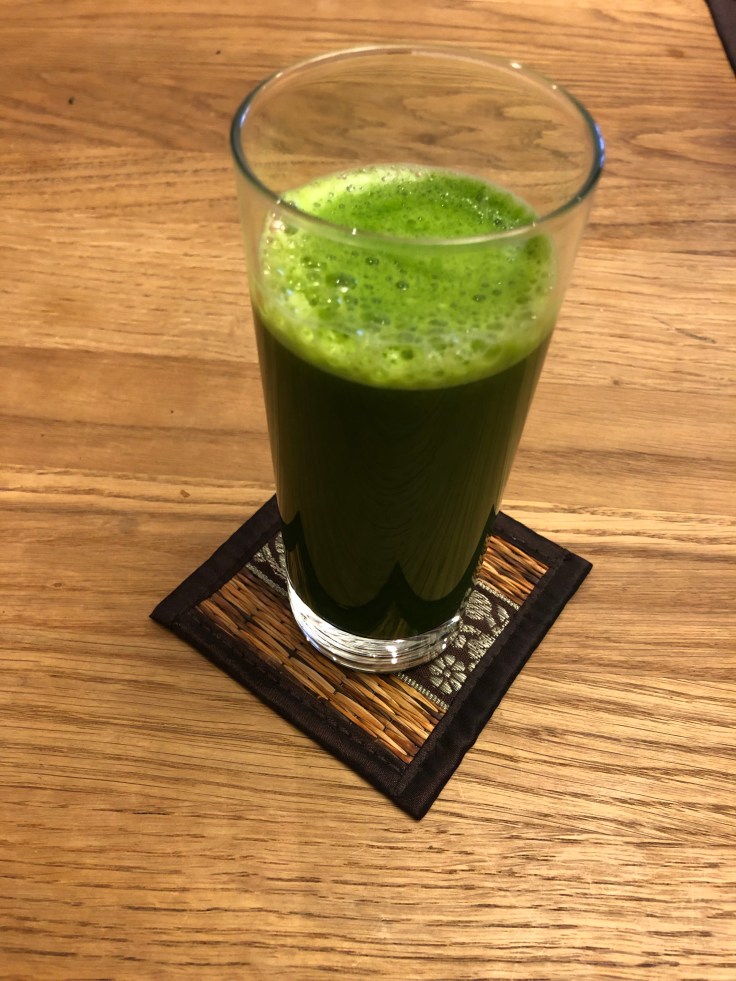 Freshly pressed juice made of organic cilantro, ginger, kale, lemon, curcuma (turmeric) and sea buckthorn.