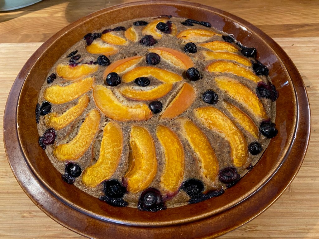 Once to batter comes together, just spread it onto a pie dish, I added melted coconut oil to the mix and did not grease the dish at all. If I would grease the dish, I would add shredded coconut first on top and then add the batter after that. Finally I just decorated the top with the berries and fruits and I had the oven nicely warmed to 180 Celsius by this time. I have a fan oven, so adjust the heat depending on your oven type. I like to cook and bake in low heat to preserve nutritions as much as possible, so the pie was in the oven for about 65 minutes. I placed it low so the top would not burn. Once ready, this pie cuts easily when warm, so enjoy at once with or without ice cream or home made apricot puree or anything that you like to add if needed. Some use maple syrup or honey, I suppose those would be great options as well.
