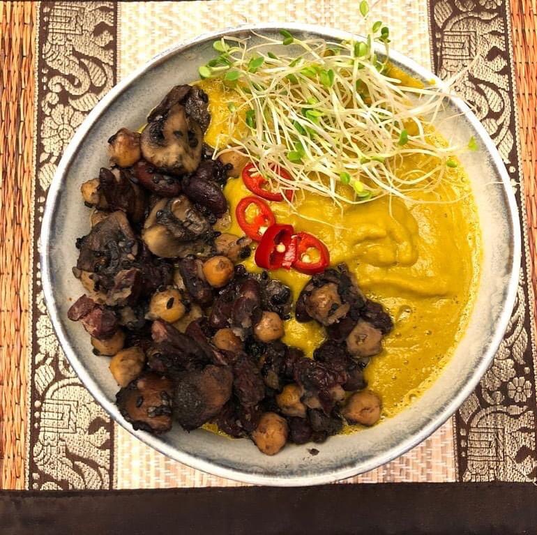 Tonight’s cancer fighting organic raw vegan keto soup made in my lovely Vitamix blender contains: a small avocado, half a leek, one small courgette, half of a garlic, approx 2 cm of turmeric – yes raw – 2 carrots chopped to small pieces, broccoli florets, a pinch of hot paprika powder (use mild if you prefer) kaffir lime leaves soaked in approx 2 cups of water which is used to dilute the soup during preparation. I garnished the ready soup with Alfa-alfa sprouts, fresh chili, roasted black sesame seeds, slightly warm button mushrooms with chickpeas and kidney beans for protein and a few drops of hemp oil. Serve it with beet juice and you have the perfect anticancer dinner that tastes great and is full of flavor and nutrition. If you need to add more calories, you can always add more avocados and hemp seeds. If keto is not your thing, try adding some roasted sweet potatoes finely chopped. The sweetness will bring out the spices ever more. Easy, quick, healthy, sugar and gluten free, energizing, just the way I like it. Bon appetit!