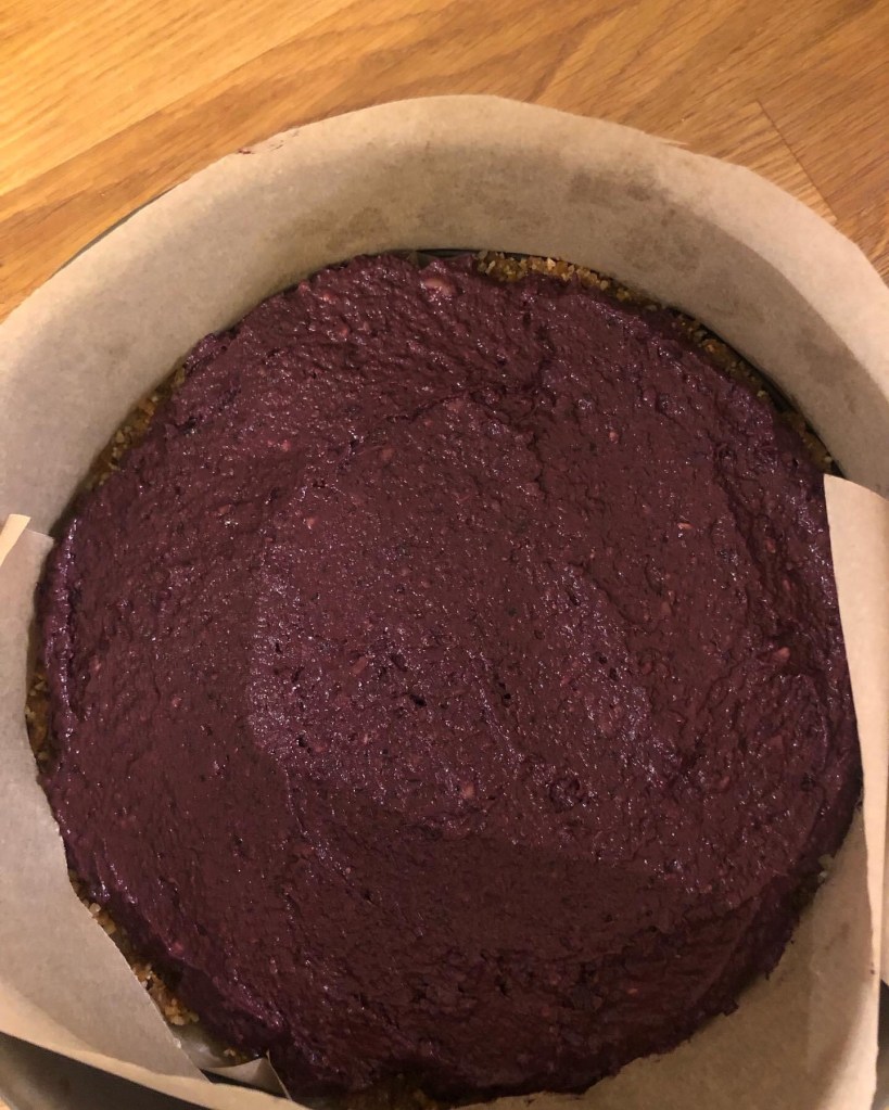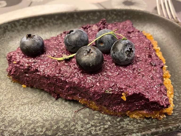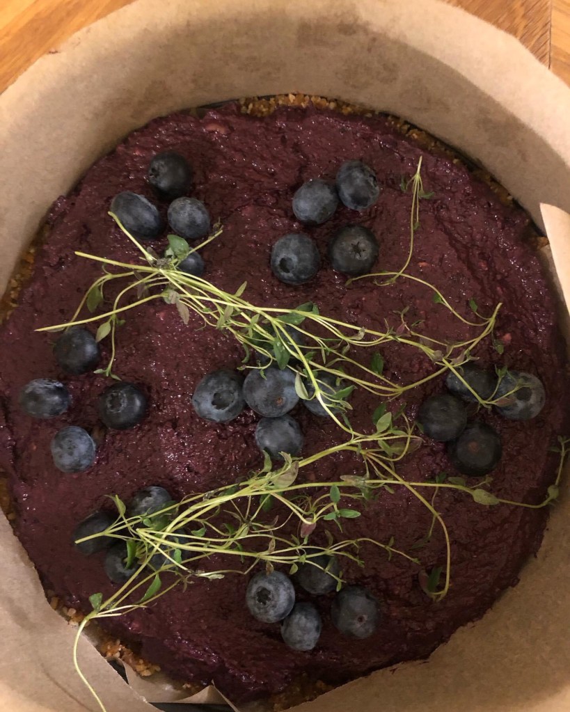 Mix the filling ingredients until smooth, pour over the base, cover with cling film and place into the refrigerator for four hours or for a few hours into the freezer. Once the cake is hard enough, add some blueberries and a few thyme leaves on top, remove from the tin, place on a beautiful serving plate and serve immediately.