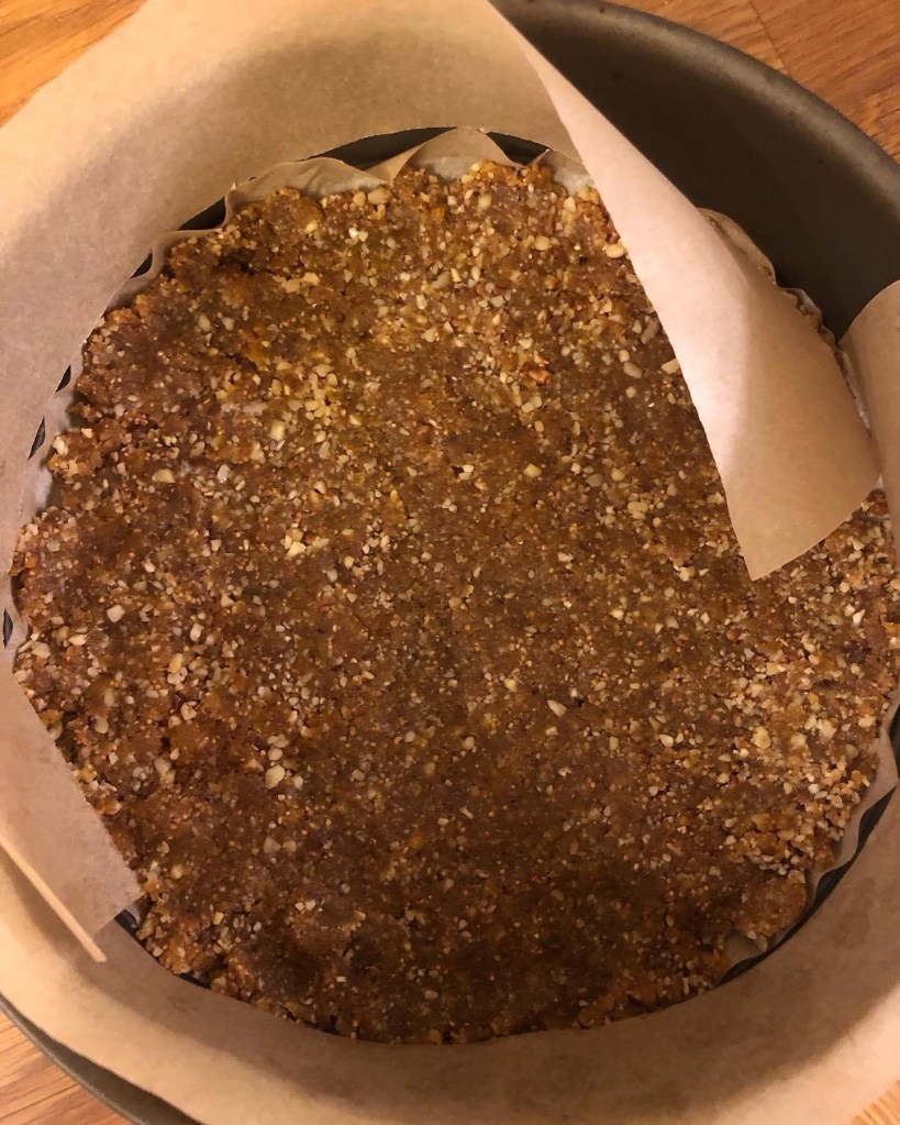 The crust is made of 100 grams of soft apricots, 120 grams of finely chopped pecans and a tiny pinch of salt (I use kosher salt for cooking).